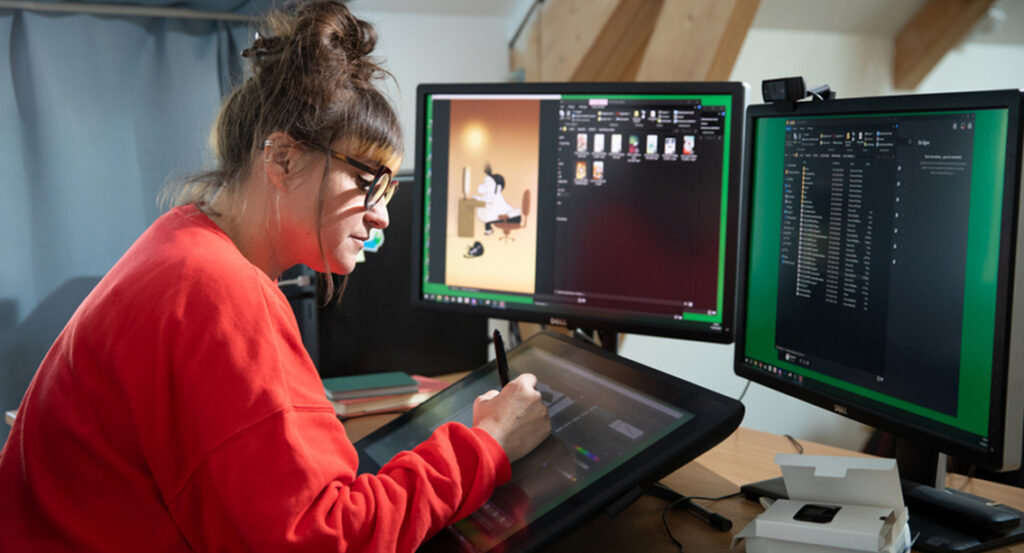 À l’origine, Douce est une série d’animation 2D classique dans sa forme : 15 épisodes de 4′ en 16/9. Moins dans son fonds puisqu’elle vise les adultes. Quand, fin 2022, nous obtenons l’engagement de TVR via le dispositif Tempo, la question du format se pose. La chaîne adore le projet mais ne le voit pas sur ses antennes. Elle voudrait se servir de Douce pour élargir son audience sur les réseaux sociaux. L’expérience est alléchante, nous n’avons jamais travaillé pour une primo-diffusion sur les téléphones. La problématique du format devient prépondérante : on ne regarde pas une œuvre de la même manière sur un mobile que sur une télévision. L’ergonomie du téléphone doit être au centre des réflexions et un téléphone se tient verticalement à une main avec le pouce prêt à swiper vers le haut pour changer de vidéo. Il était pour moi inconcevable de proposer une œuvre en 16/9 qui aurait été, la plupart du temps, vue dans une taille minimale. Douce devait être produite dans le format 9/16 pour que le spectateur puisse profiter au mieux de la série. TVR a immédiatement accepté cette proposition. Après de légitimes inquiétudes, Isabelle a été conquise par les possibilités de mise en scène que lui offrait ce format en réalisant le storyboard du premier épisode.